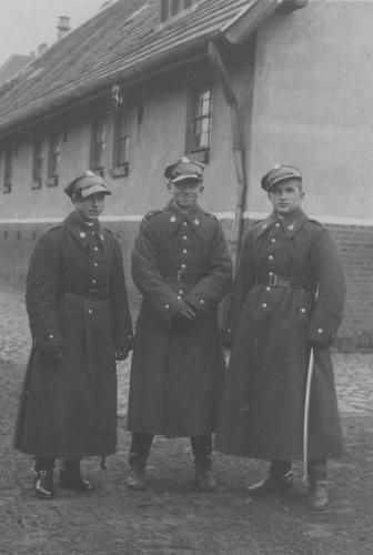 Photo of Zoska Battalion: Left to Right: Polish resistance fighters Wojciech Omyla, Juliusz Bogdan Deczkowski, and Tadeusz Milewski in captured German uniforms and Kar98k rifles, Warsaw, Poland, 5 Aug 1944.